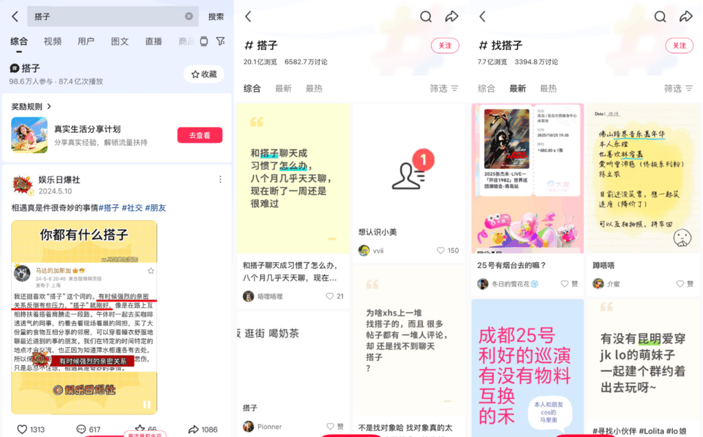 同時に、SNSという即時マッチングのインフラが普及したことが、「搭子」文化の拡散を後押しした。微博や小紅書、抖音などで短文の募集をかけ、ハッシュタグや投稿を通じて同好者を速やかに結び付ける動きは、生活上のニーズと技術的整備が噛み合った結果である。実際の調査でも、多くの若者が「寄り添い型の人付き合い」を必要としていると答えており、搭子はそのニーズを効率的に満たす仕組みとして機能している。